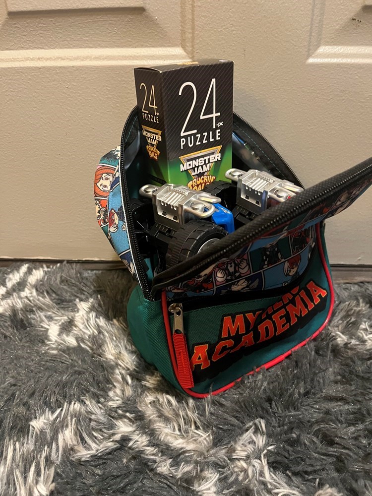 Two monster trucks and a puzzle in a bag.